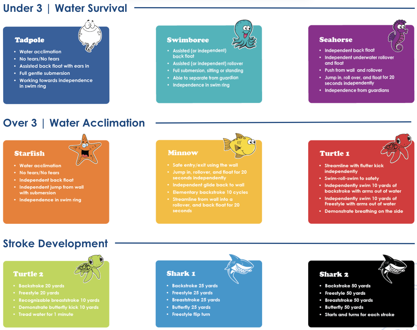 Each level in our swim program is designed to build upon the previous one. Every level includes five core skills. These skills are further broken down into sub-skills, allowing students to gradually develop and perfect each technique. We get so excited when our students complete a sub-skill because they are progressing towards mastering the main skill!